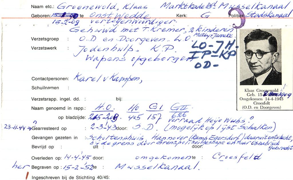Systeemkaarten met namen van personen uit het verzet: Klaas Houkes