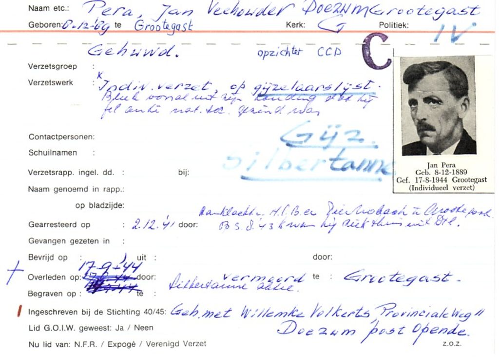 Systeemkaarten met namen van personen uit het verzet: Jan Pera