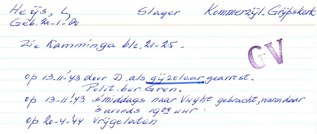 Helper KP Slochteren. Kaart bevat verder veel doorgestreepte mededelingen, er is kennelijk verwarring met slager L. Heijs uit Kommerzijl geweest [Aanvullende gegevens van betrokkene zijn ontleend aan een lijst in de map Slochteren]