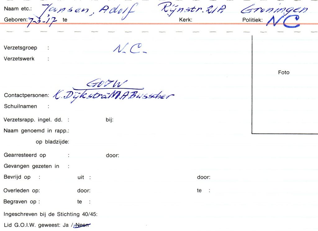 Systeemkaarten met namen van personen uit het verzet: Thies Jan Jansen