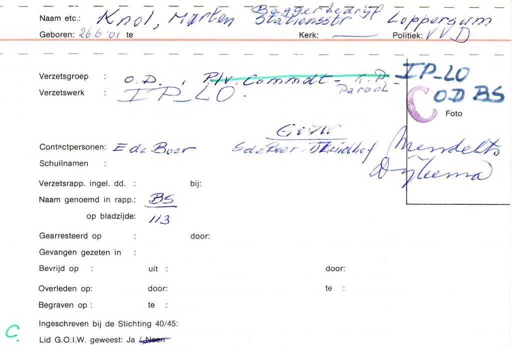 Systeemkaarten met namen van personen uit het verzet: Marten Dijkhuis