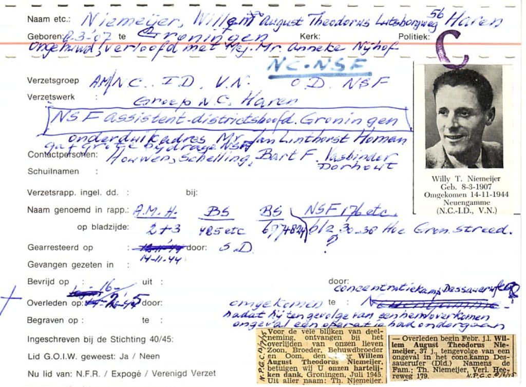Heeft stakers in mei '43 aangemoedigd, zie HO 257-258. Betrokkene was na de oorlog POD-medewerker in Uithuizen Gearresteerd door onderluitenant van Krimpen, 05-06-1943, vier dagen nadat betrokkene gedetacheerd was in Westerbork. Gevangen gezeten in de marechaussee kazerne in Groningen, via SD naar het Huis van Bewaring en Vught. Veroordeeld tot drie jaar tuchthuisstraf en tewerkgesteld in een Duitse vliegtuigfabriek. Daaruit bevrijd door de Russen, 26-04-1945. Betrokkene komt voor op een lijst van Nederlanders die op 27 april uit het concentratiekamp Sachsenhausen (Aussenkommando Rathenow) bevrijd zijn