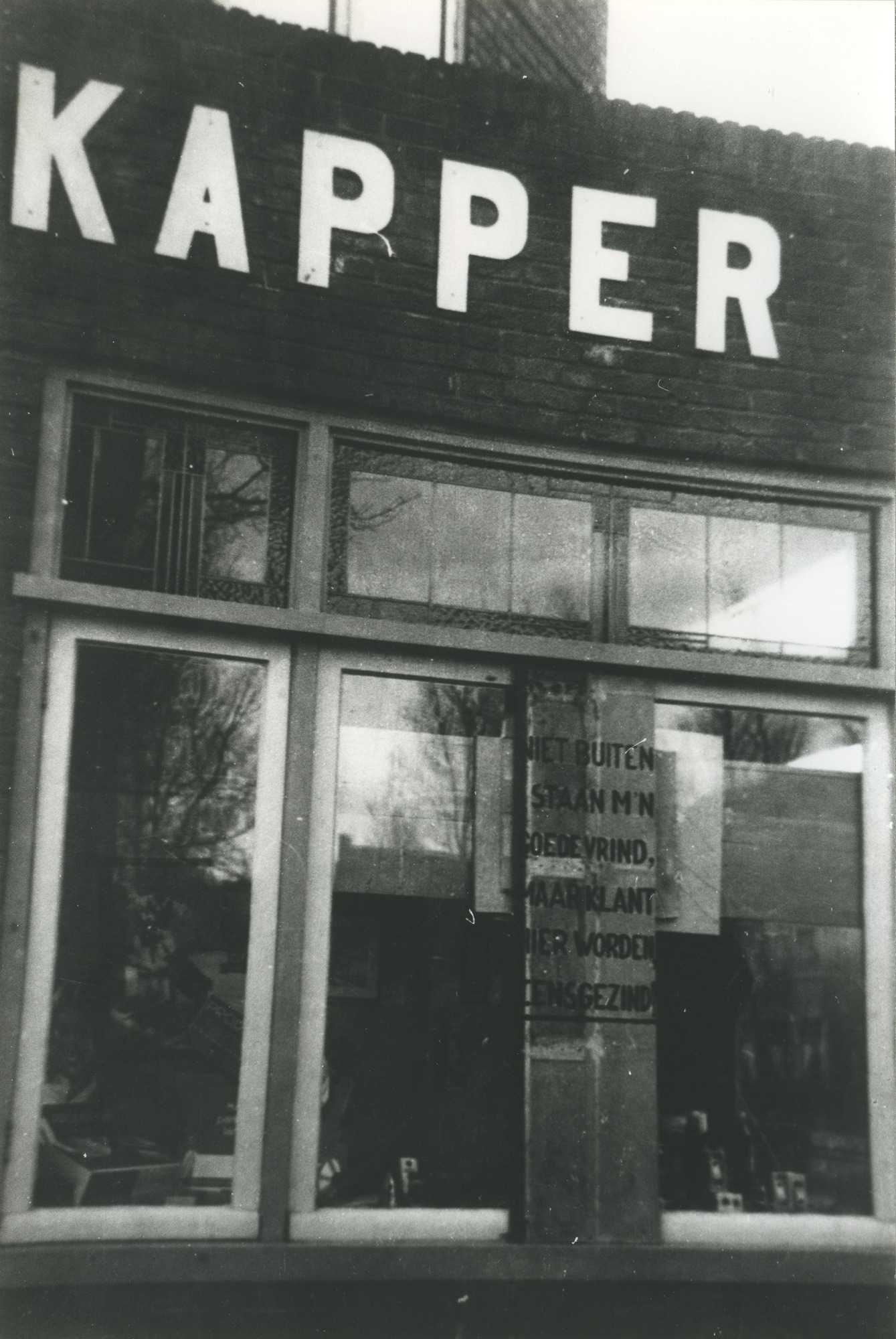 Stukgegooide etalageruit bij kapperszaak en fotohandel de Does, Rippingstraat 1. Voor de ruit een bord met de tekst 'Van buiten is het opgelapt, hier binnen wordt u opgeknapt'.
