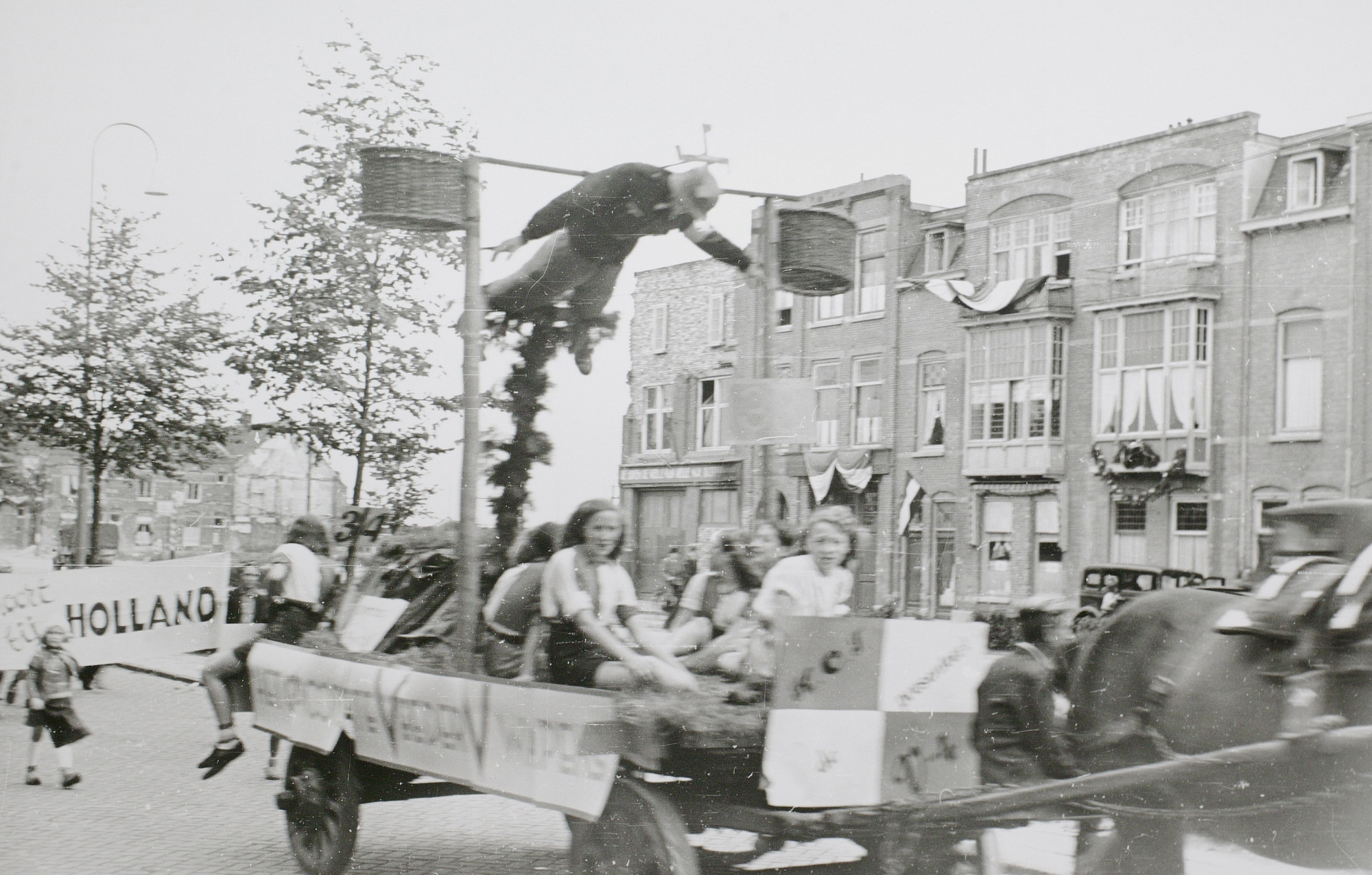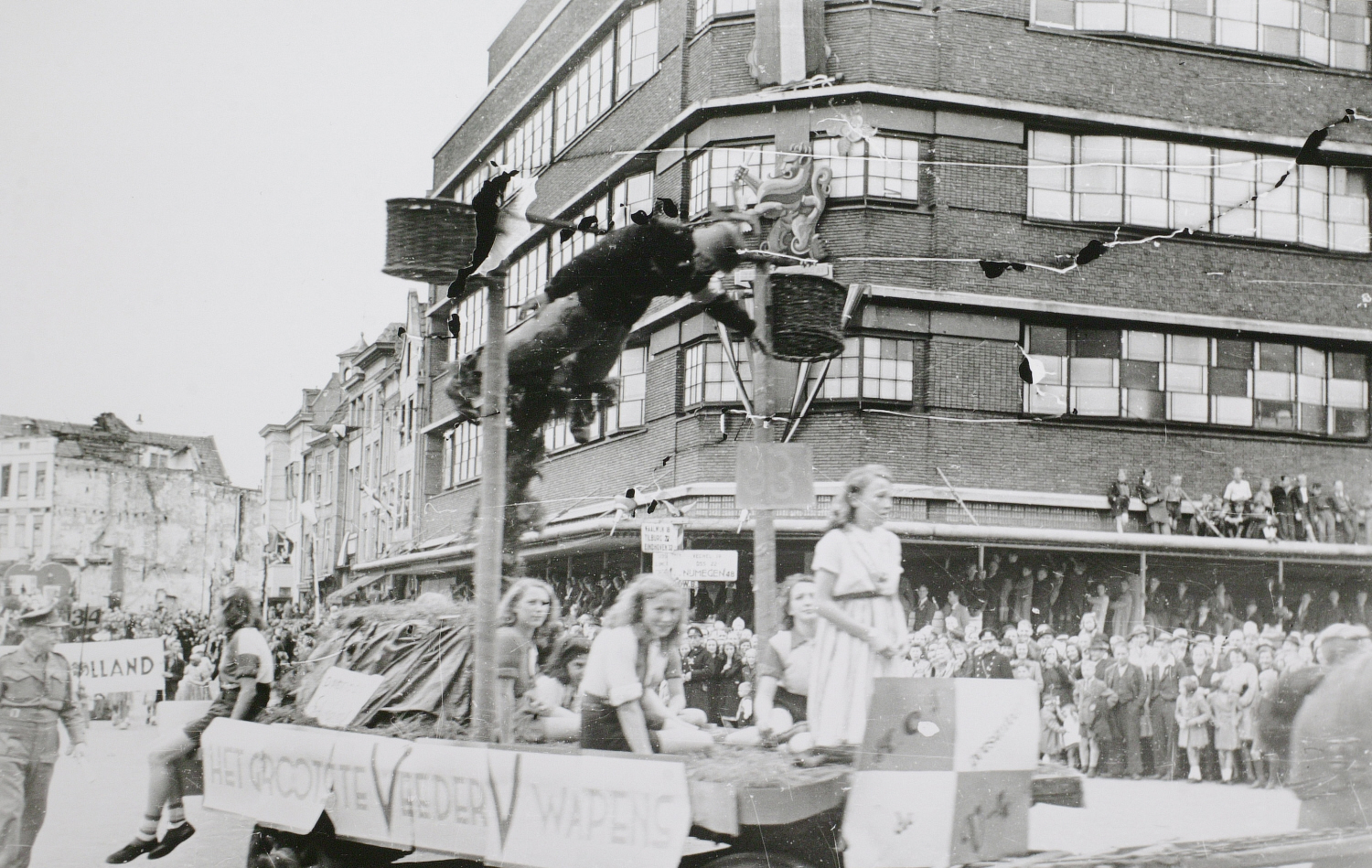Viering 1e koninginnedag na de bevrijding. Praalwagen met pop voorstellend opgehangen Duitse soldaat tussen 2 korfbalstaanders komend van de Pensmarkt. Motto van de wagen "De korfbalclub Taxandriaplein presenteert de V4" .