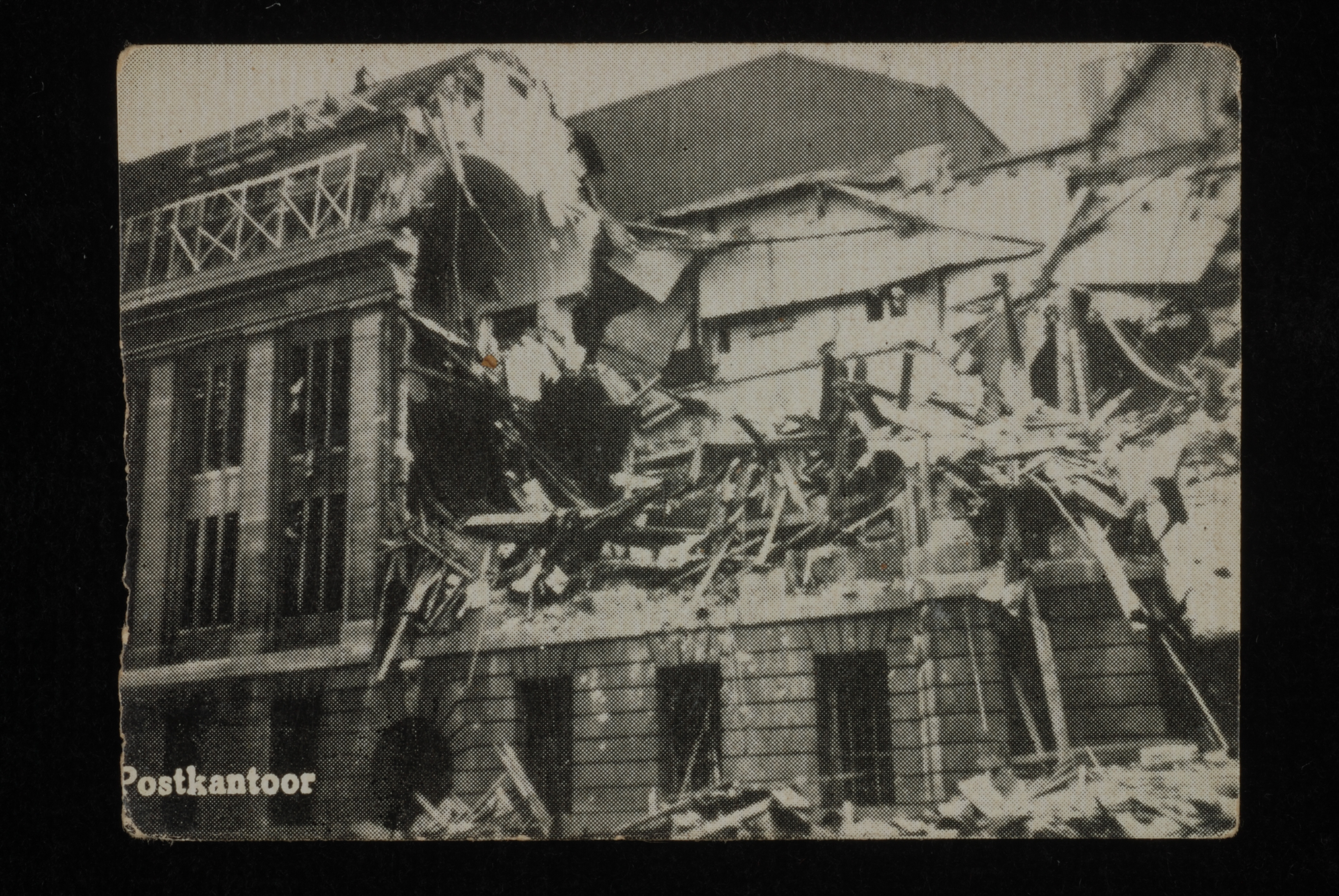 Mobilisatiebevel voor leger en vloot, affiches aangeplakt op de gevel van het postkantoor. Enkele mannen nemen de tekst tot zich