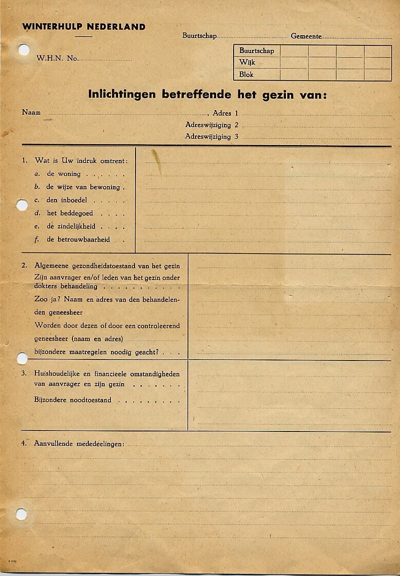 Blanco formulier voor gezinnen met Winterhulp. Linksboven staat vetgedrukt 'Winterhulp Nederland'. Midden bovenaan staat vetgedrukt: 'Inlichtingen betreffende het gezin van'.