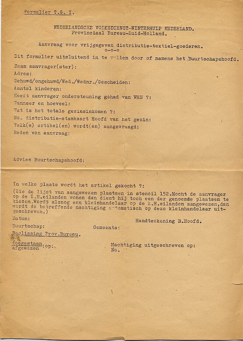 Formulier voor het aanvragen van textielgoederen van de Nederlandsche Volksdienst-Winterhulp Nederland.
