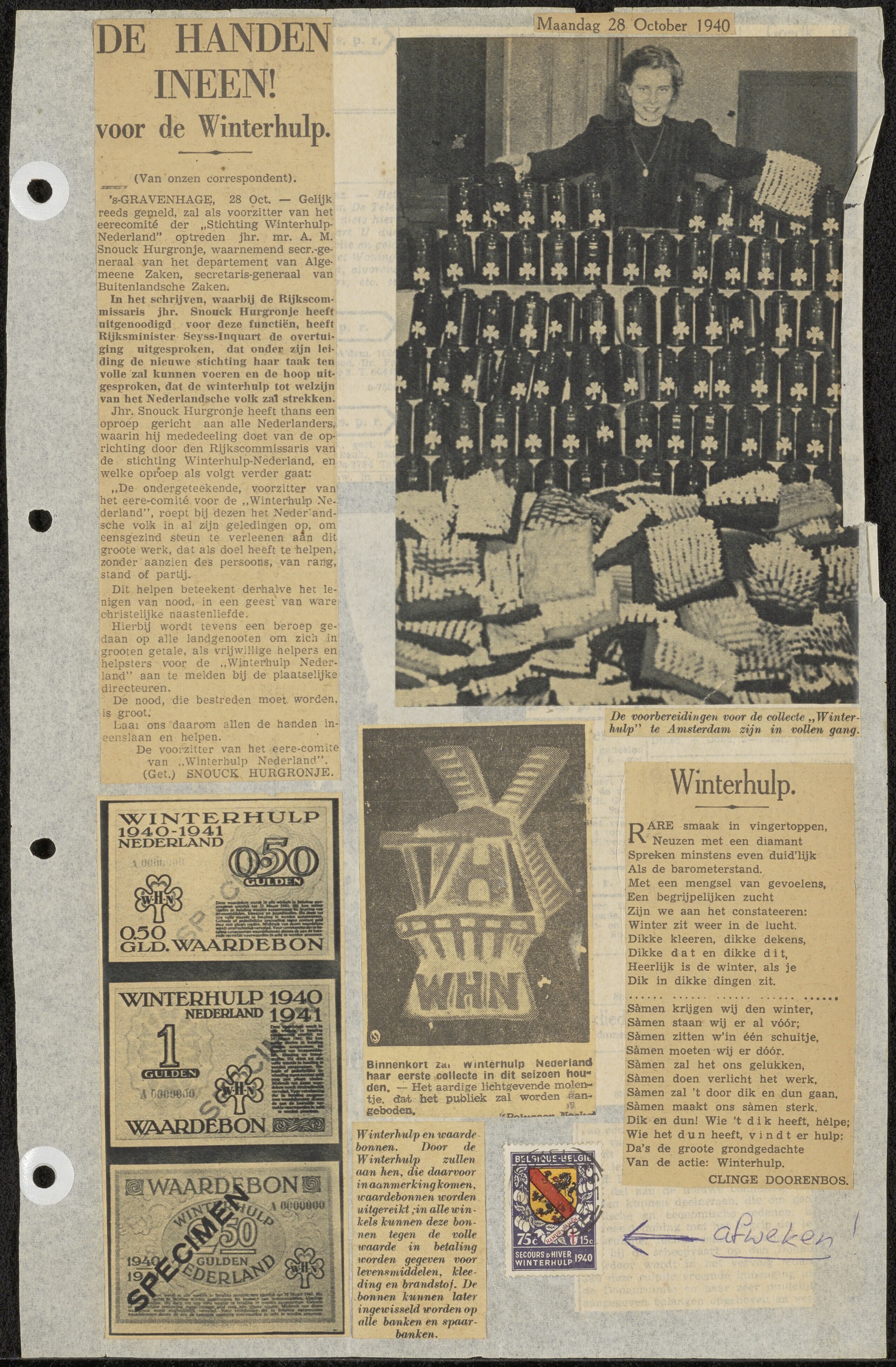 Een blad met knipsels en postzegel met aan de linkerkant vier ponsgaten. De knipsels hebben betrekking op de Winterhulp.