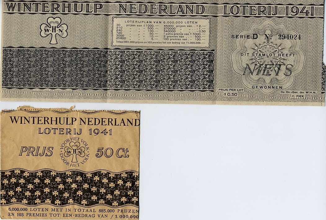 Twee loten van de Winterhulp Nederland, waarvan één met bijbehorende enveloppe. Bovenaan het lot de tekst 'Winterhulp Nederland Loterij 1941', links het logo WHN, in het midden 'Loterijplan van 6.000.000 loten'. Over een van de loten een rood stempel met: ''Betaald''. Op het andere staat vermeld: "Dit stamlot heeft niets gewonnen.''