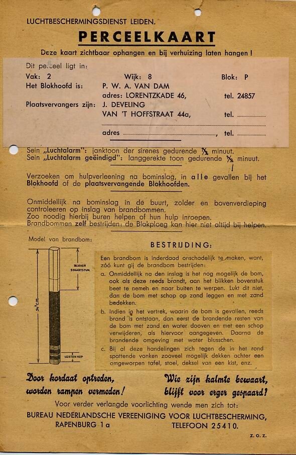 Perceelkaart van de Luchtbeschermingsdienst Leiden. Op de voorkant van de kaart staan adressen van het blokhoofd en zijn plaatsververvanger, een tekening en bestrijdingsuitleg van een brandbom en andere informatie. Op de achterkant van de kaart staan zeven "Algemeene gedragsregels" tijdens een luchtalarm.