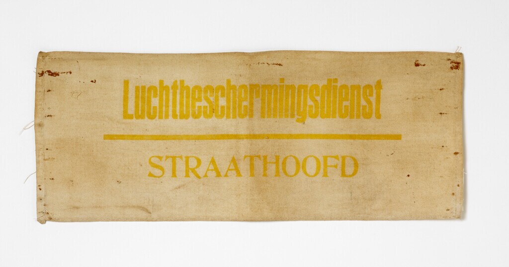 Een witte katoenen mouwband met gele opdruk: 'Luchtbeschermingsdienst - Straathoofd'.