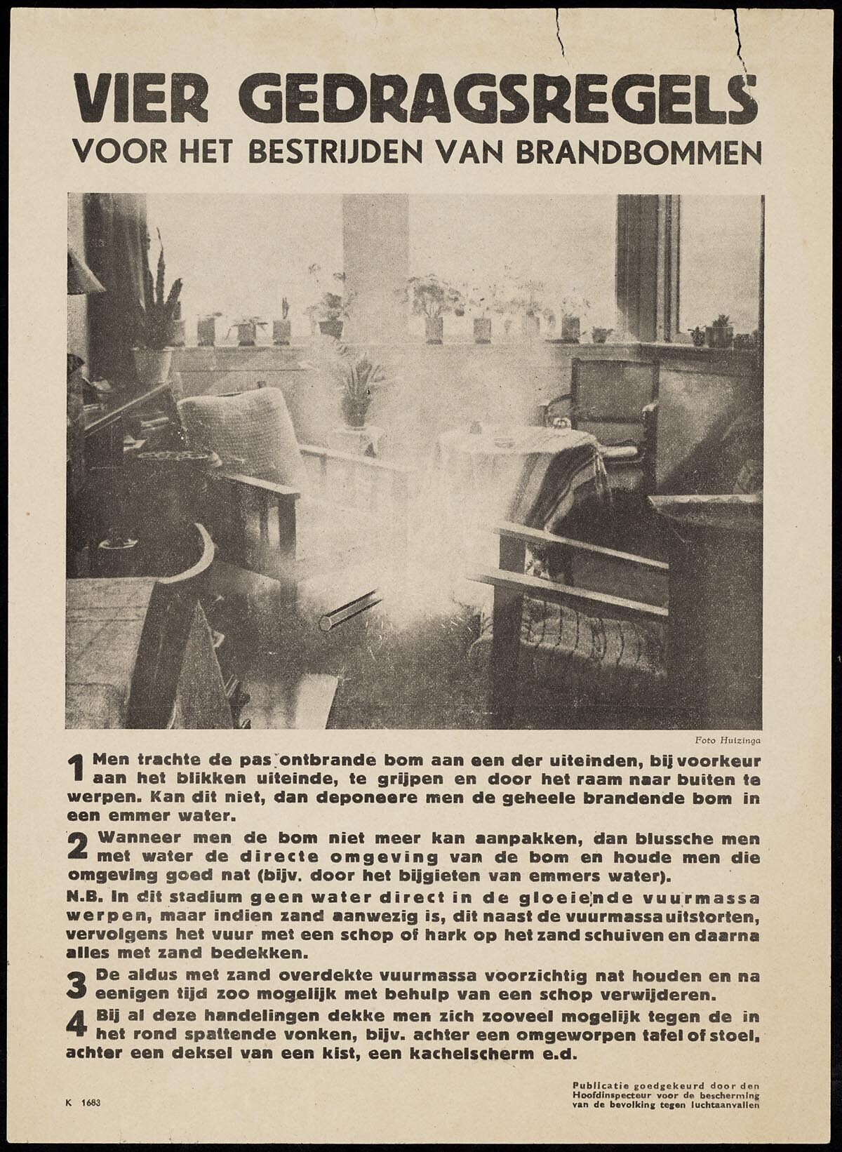 Richtlijnen over het bestrijden van een brandbom. Onder de titel is een foto geplaatst van een huiskamer met een brandende bom.