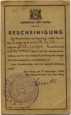 Een op één kant in het Duits gedrukte grijze kartonnen kaart uitgegeven door de gemeente Den Haag op naam van R.G.W. Lagraauw, waarin wordt verklaard dat hij werkzaam is bij de gemeente en daardoor gevrijwaard is van de Arbeidsinzet.
