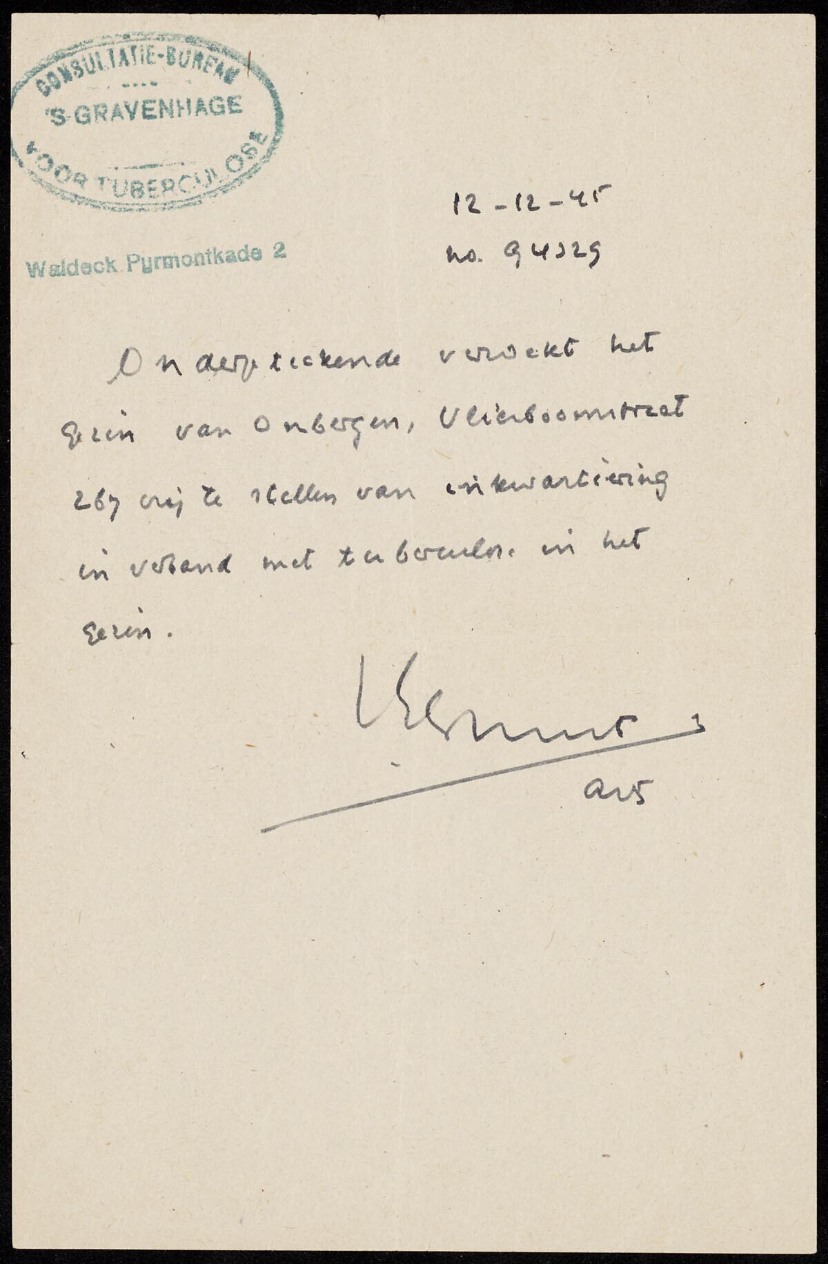 Handgeschreven brief met stempel van het Consultatie-bureau voor tuberculose in Den Haag en ondertekend door een arts: "Ondergetekende verzoekt het gezin van Ombergen, Vlierboomstraat 267, vrij te stellen van inkwartiering in verband met tuberculose in het gezin."