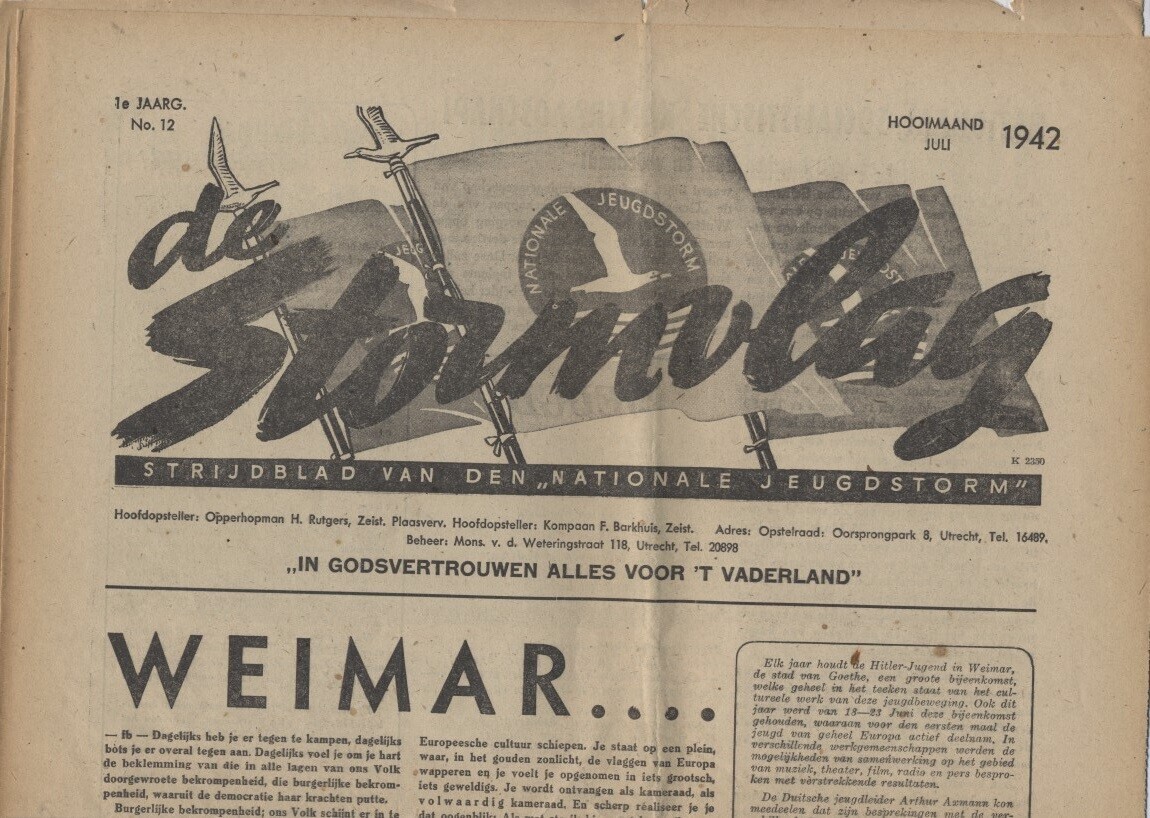 Vier exemplaren van ''De Stormvlag. Strijdblad van de Nationale Jeugdstorm". Het betreft de nummers 12 (jaargang 1), 1, 3 en 5 (jaargang 2) uit 1942.