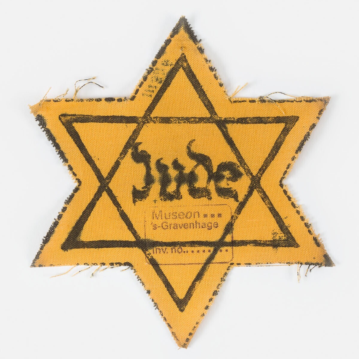 Een stervormig stuk gele katoen met daarop in zwart gedrukt een Davidsster met in het midden het woord 'Jude' in gotisch schrift. Deze ster is uit een grotere lap met vergelijkbare 'Jodensterren' geknipt.