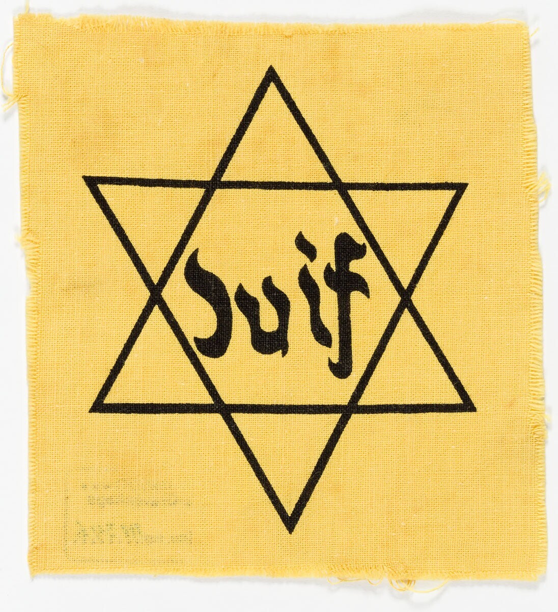 Een rechthoekig stuk gele katoen met daarop in zwart gedrukt een Davidsster met in het midden het woord 'Juif' in gotisch schrift. Dit stuk katoen komt van een grotere lap met vergelijkbare 'Jodensterren'. Het was de bedoeling dat men de ster zelf uitknipte. Dit is hier niet gedaan.