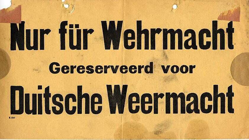 Een rechthoeking papier met aan beide zijden de tekst: "Nur fÂur Wehrmacht. Gereserveerd voor Duitsche Weermacht'. Dit soort aanplakbiljetten werd in gereserveerde treinwagons opgehangen.