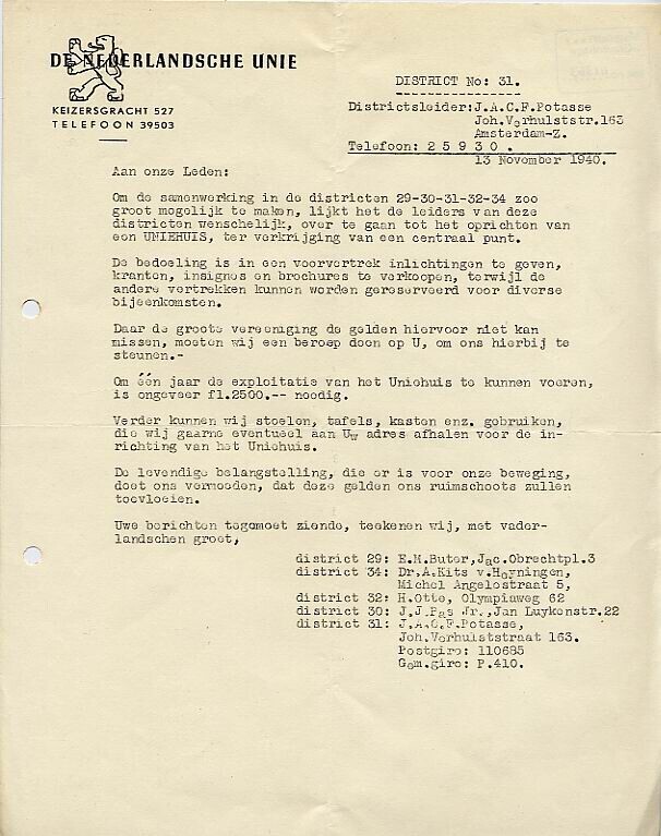 Twee gestencilde documenten met het briefhoofd van de Nederlandsche Unie. Het ene is een brief waarin de oprichting van een 'Uniehuis' voor de districten 29 tot en met 34 wordt aangekondigd. Het andere bevat een plattegrond van het huis en een bon waarmee men kenbaar kan maken dat men een bedrag op rekening van de organisatie wil storten of meubilair voor het clubhuis ter beschikking wil stellen.