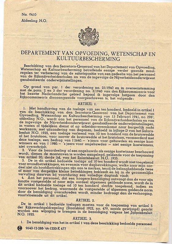 Een dubbelzijdig bedrukt blad met een beschikking door het "Departement van Opvoeding, Wetenschap en Kultuurbescherming" betreffende de verbetering van de salarispositie van onderwijzend personeel.