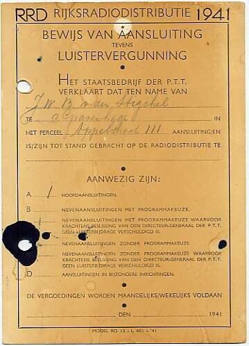 Bewijs van aansluiting en luistervergunning van de Rijksradiodistributie op naam van J.W.B. van der Stigchel.
