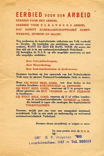 Twee in grootte verschillende pamfletten met aan een zijde met rode en witte letters bedrukt vel papier, gericht tegen de bestrijding van de N.S.B.: ''door Unie-joden-leugens, door Meyer-bedrog, door haat-mandementen en kerk-terreur.'' Onderaan de verwijzing: ''Ga eens praten over de N.S.B. bij:". Op het grootste pamflet is onder deze aanhef een stempel aangebracht met: "G.F. Wagener, Loosduinsew. 1137 - Tel. 398317".