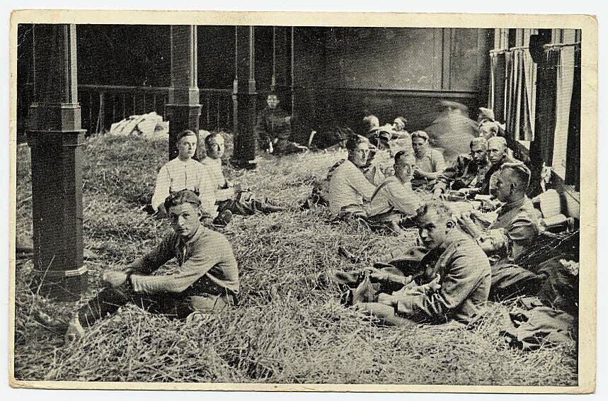 Zwartwit ansichtkaart van een groep soldaten zittend op een vloer die bedekt is met stro. Het is een kaart uit de tweede serie van "Nederland paraat".