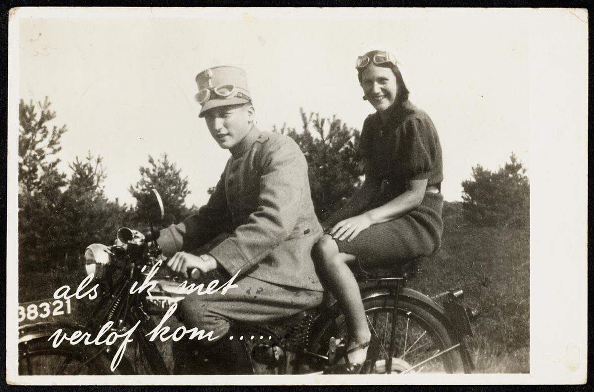 Gebruikte ansichtkaart met een zwartwitfoto van een militair op een motor, met achterop een vrouw. Uitgave: "Fa. Louis de Jong Szn. A'dam".