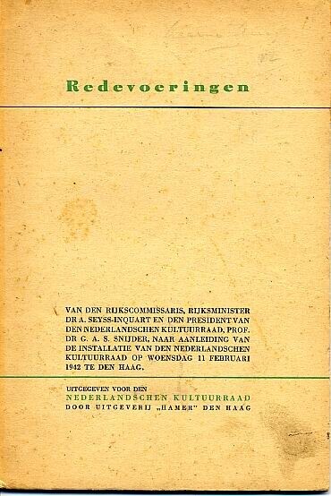 Twee uitgaven van "Redevoeringen van den Rijkscommissaris, Rijksminister Dr A. Seyss-Inquart en den president van den Nederlandschen Kulturraad, Prof. Dr. G.A.S. Snijder, naar aanleiding van de installatie van den Nederlandschen Kultuurraad op woensdag 11 februari 1942 te Den Haag." Het boekje is "uitgegeven voor den Nederlandschen Kultuurraad door uitgeverij "Hamer" Den Haag" en telt 36 pagina's.