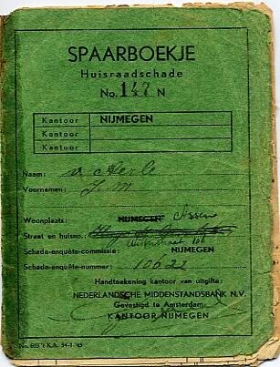 Spaarboekje van de Nederlandsche Middenstandsbank NV. voor huisraadschade. Het spaarbedrag mocht alleen gebruikt worden voor aankoop van meubels e.d. en niet voor verbruiksgoederen zoals kleding en voedingsmiddelen. De datering van de stortingen loopt van augustus1946 tot en met overboeking februari 1951. <br><br><br>