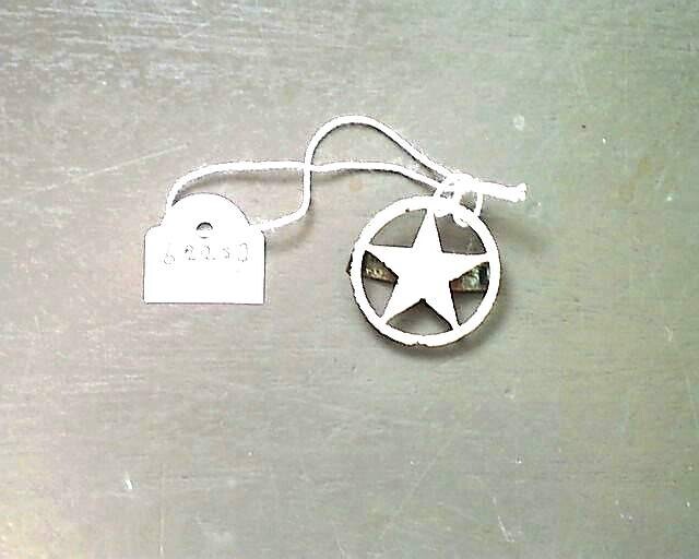 Een rond witgeschilderd metalen embleem met daarin uitgezaagd een vijfpuntige ster. Op de achterkant twee clipjes.