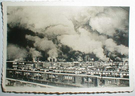 Een foto van brandend rotterdam gezien vanuit Blijdorp na Het Duitse bombardement van 14 mei 1945.
