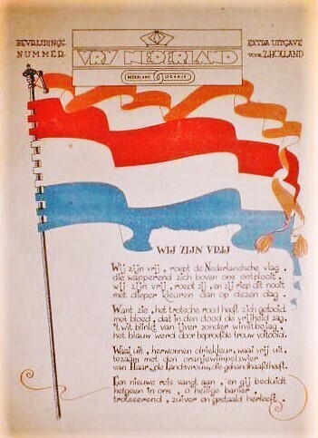 Het 'Bevrijdingsnummer' van Vrij Nederland, extra uitgave voor Zuid-Holland met in kleurendruk de afbeelding van de Nederlandse vlag met oranje wimpel. Daaronder het gedicht: "Wij zijn vrij".