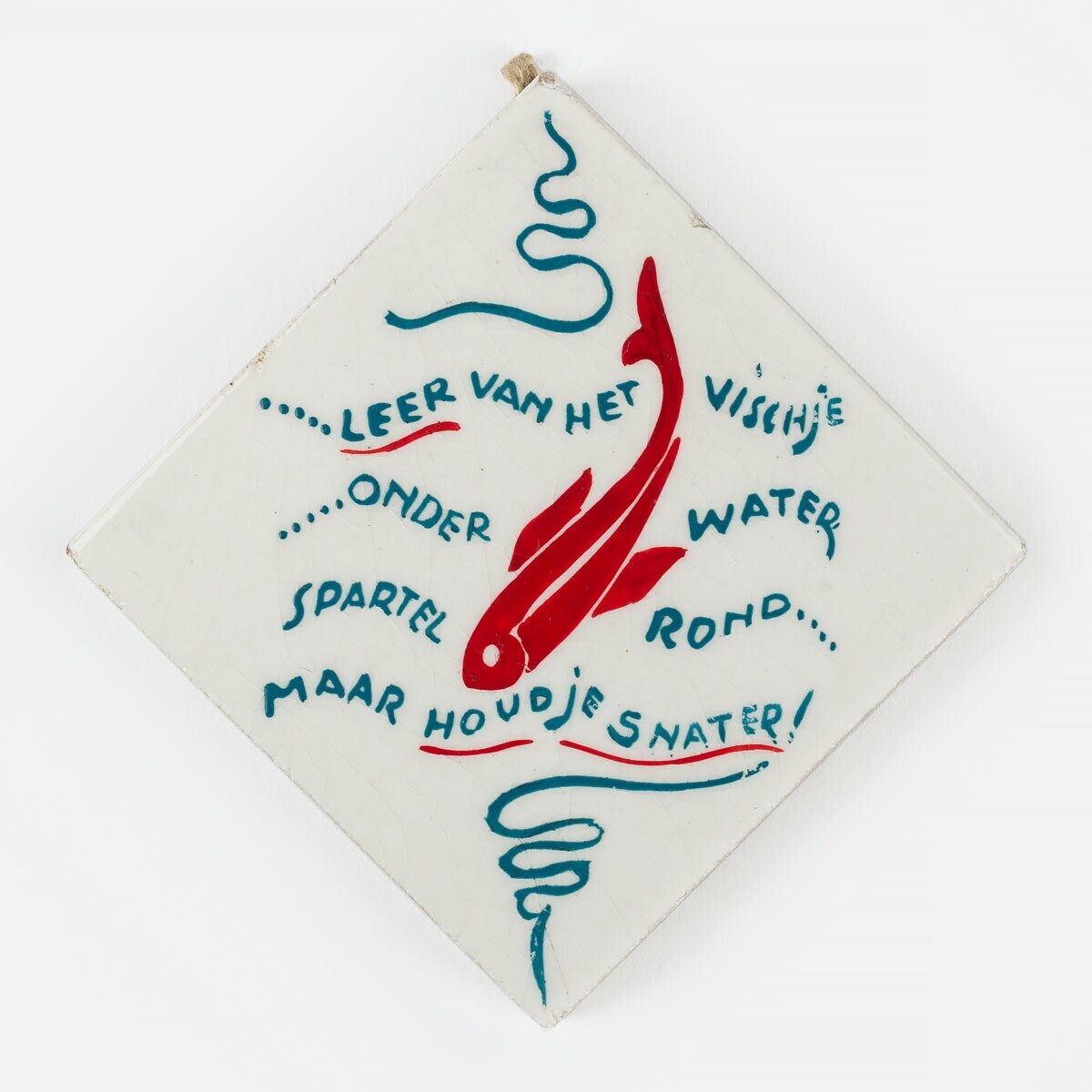 Een witte keramieken siertegel met opschrift in groen rond een rood visje: "Leer van het vischje onder water, spartel rond... maar houd je snater!". Deze onschuldig ogende tegels waren bedoeld om mensen aan te manen om niet te loslippig te zijn omdat de Duitse bezetter meeluisterde met gesprekken. Winkeliers zoals Henk van Elewout (1906–1945) uit Voorburg verkochten dit soort verzetstegels in hun zaak. De opbrengsten gingen naar het werk van de ondergrondse.