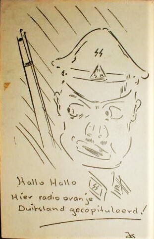 Een spotprent met de afbeelding van het portret van een militair met op zijn uniform de symbolen van de SS en van de N.S.B. Daaronder: "Hallo, hallo, hier radio Oranje. Duitschland gecapituleerd!"