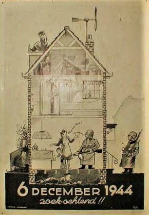 Een pamflet met de afbeelding in zwartwit van een doorsnede van een woonhuis in doorsnede, waar bewapende Duitse soldaten een razzia houden. De Duitse soldaat vraag: "Ihr Mann" en de vrouw des huizes met haar zoontje achter haar antwoord: "hij is niet thuis" terwijl overal in het huis mannen zijn verscholen.