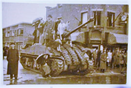Een zwartwit foto van vrouwen en mannen op een tank in een straat.