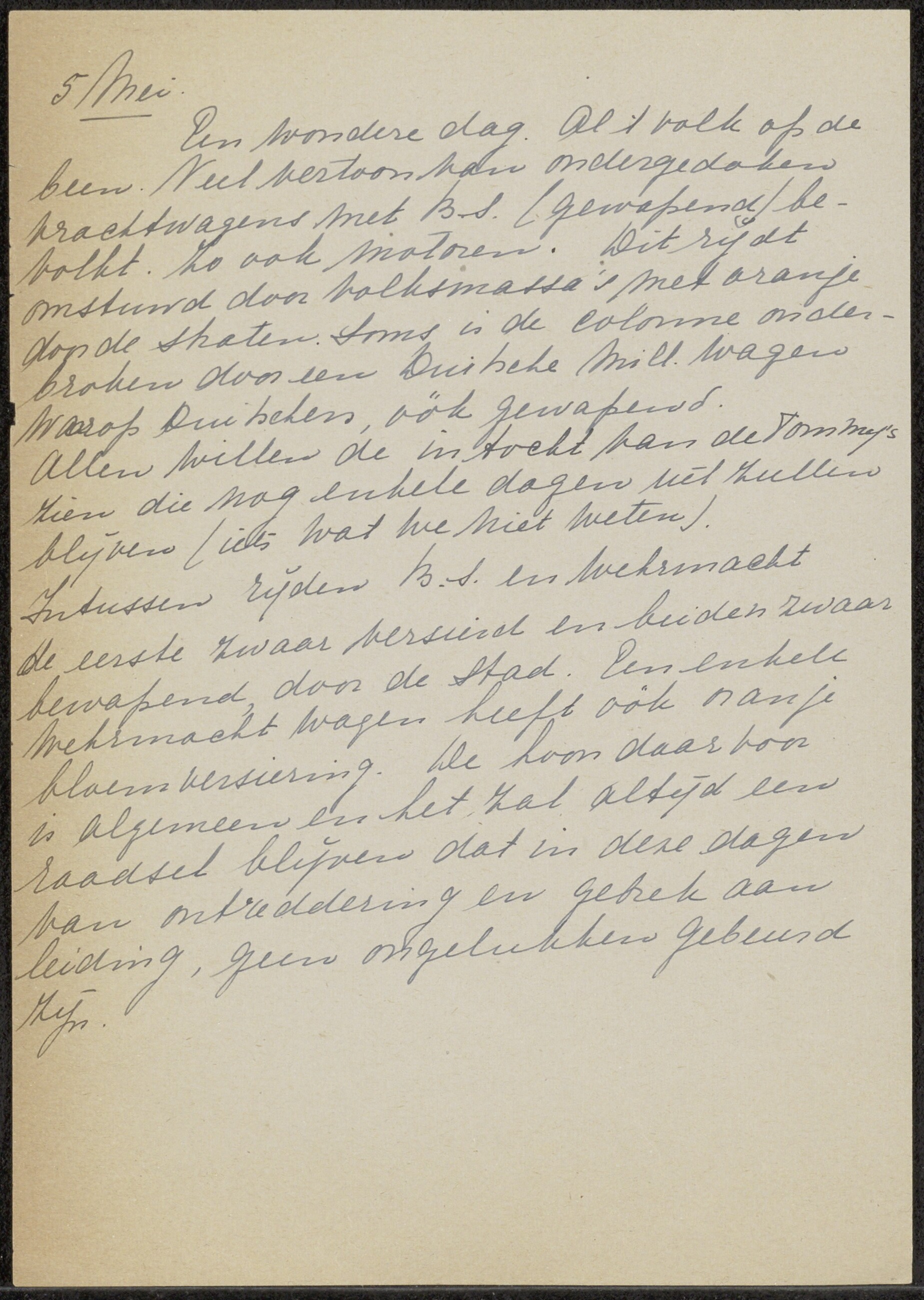 Een handgeschreven dag aantekening op wit verkleurd papier. De gebeurtenissen rond de bevrijding op 5 mei 1945 worden beschreven, zoals de volksmassa's die met oranje door de straten lopen en de intocht van de Tommy's.