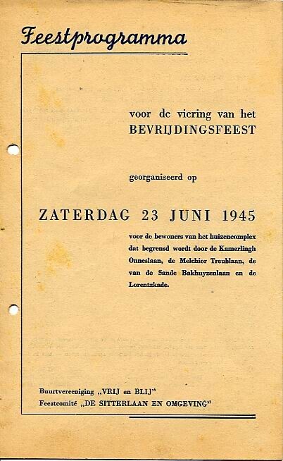 Feestprogramma voor de viering van het Bevrijdingsfeest op zaterdag 23 juni 1945, door Buurtvereniging "Vrij en Blij", en Feestcommissie "De Sitterlaan en Omgeving". Bij het programma zijn twee deelnemerskaarten gevoegd.