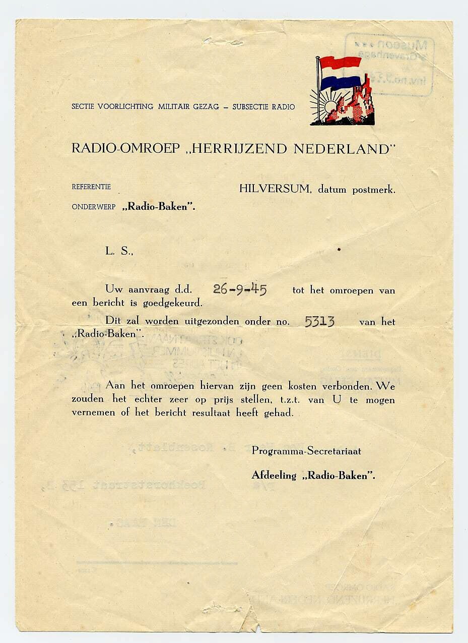 Een voorgedrukte verklaring van de "Sectie Voorlichting Militair Gezag - Subsectie Radio" ingevuld met een typemachine, geadresseerd aan de heer B. Rosenblatt, Boekhorststraat 153 B te Den Haag met poststempel 7 november 1945. Hierin wordt medegedeeld dat zijn aanvraag d.d. 26 september 1945 tot het omroepen van zijn bericht in verband met de opsporing van vermiste personen is goedgekeurd. De brief is verstuurd vanuit Hilversum en betreft de radio-omroep "Herrijzend Nederland". In het briefhoofd een beeldmerk van een Nederlandse vlag met op de achtergrond ruïnes en daarachter een opgaande zon.