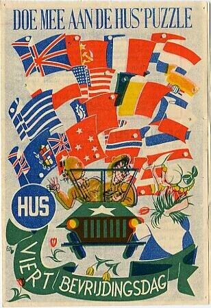 Dubbel gevouwen reclamefolder in kleurendruk van bakkerij Hus. Op de voorkant zijn 16 vlaggen afgebeeld, een jeep met geallieerde soldaten en een meisje in klederdracht. De achterzijde is een invulformulier waarop de namen van de landen met potlood zijn ingevuld. De prijsvraag moest voor 15 mei zijn ingeleverd bij een Hus filiaal of de bezorger.