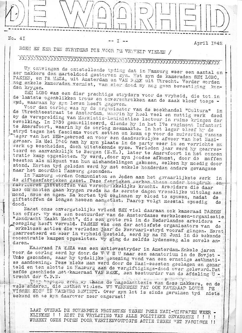 Een twee pagina's tellende gestencilde uitgave van van het dagblad 'De Waarheid' nummer 41 van april 1942 .