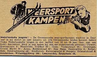 Een advertentie voor "Germaansche weersportkampen" voor Nederlandse jongens met illustraties van skiën en schieten.
