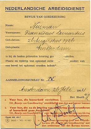 Een 'Bewijs van goedkeuring' van de Nederlandsche Arbeidsdienst, Aanmeldingsbureau nr. IV te Amsterdam, waarbij Franciscus Leonardus Neuman geschikt is bevonden voor de arbeidsdienst.