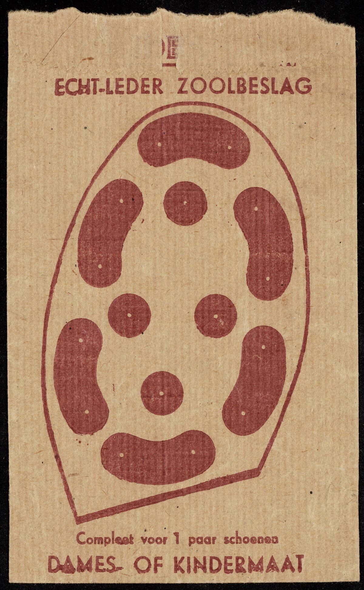 Een leeg bruin papieren zakje met de tekst: "Echt leder zoolbeslag. Compleet voor 1 paar schoenen. Dames- of Kindermaat". Op het zakje een afbeelding van leren zoolstukjes aangebracht binnen de omtrek van een schoenzool van de voorvoet. Daarbij een blad met twee omtrekken van de schoenzool van een voorvoet met daarop geplakt bruine leren zoolstukken volgens het voorbeeld op het zakje. Op het blad is een zakje geplakt met kleine spijkertjes. Op de achterkant van het blad staat: "Durabel" Zoolbeslag met spijkers. Voldoende voor 1 paar schoenen".
