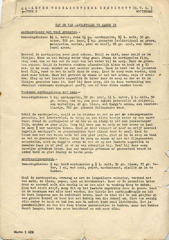 Elf aardappelrecepten van Unilever Voorlichtings Instituut (U.V.I.) te Rotterdam getypy op drie bladzijden.