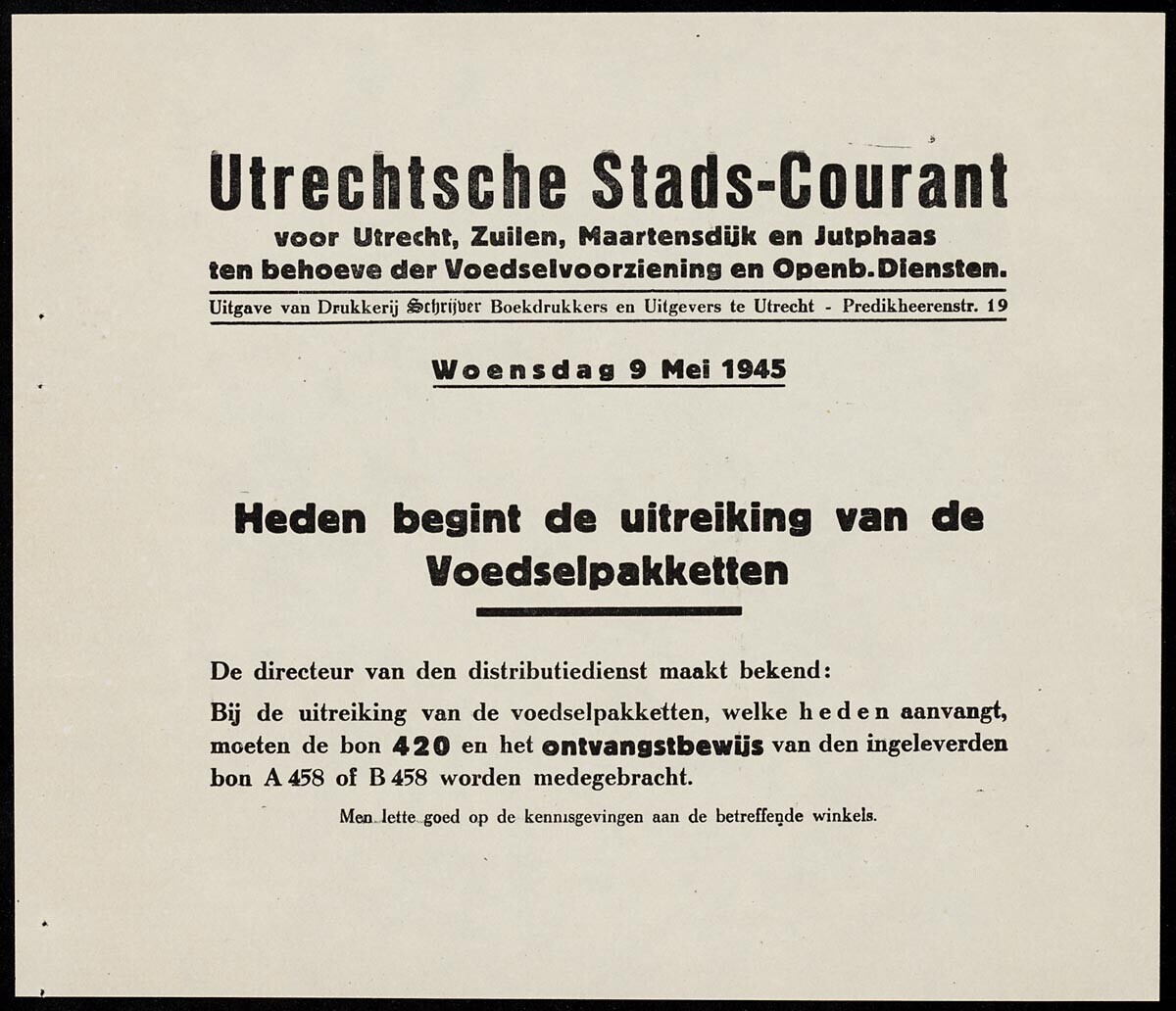 Bekendmaking door de "Utrechtsche Stads-Courant voor Utrecht, Zuilen Maartensdijk en Jutland t.b.v. Voedselvoorziening en Openb.diensten." Woensdag 9 mei 1945: "Heden begint de uitreiking van de Voedselpakketten" waarbij bon 420 en ontvangstbewijs van bon A-458 of B-458 moeten worden ingeleverd.
