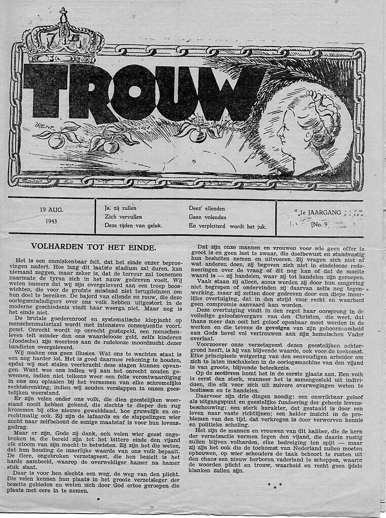 Een exemplaar van "Trouw": eerste jaargang, no. 9 van 19 augustus 1943.