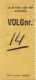 Lichtbruine strook met de tekst "Bewaar dit formulier zorgvuldig!". Tegen inlevering van de bon konden Rode Kruis goederen worden afgegeven. Op de andere zijde is volgnummer 14 met potlood genoteerd.