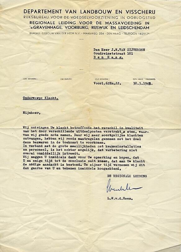 Getypte brief van het Departement van Landbouw en Visserij afd. Regionale leiding voor de massavoeding aan de heer J.W. van Zijverden over het verschil in kwaliteit van het eten bij de verschillende uitdeelposten. Bij de brief zit een dienstenveloppe met bruine opdruk: Rijksbureau voor de Voedselvoorziening in Oorlogstijd.